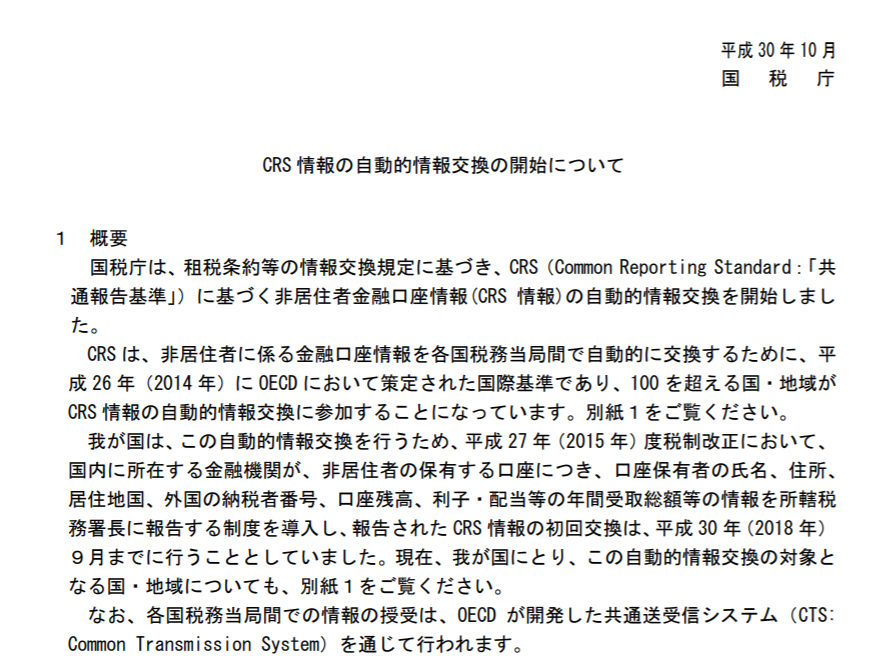 OECD(日本語で経済協力開発機構 欧州諸国、米国、日本などを含む34カ国の先進諸国によって構成)のCRSが施行され、日本では2018年に情報交換がスタートしました。